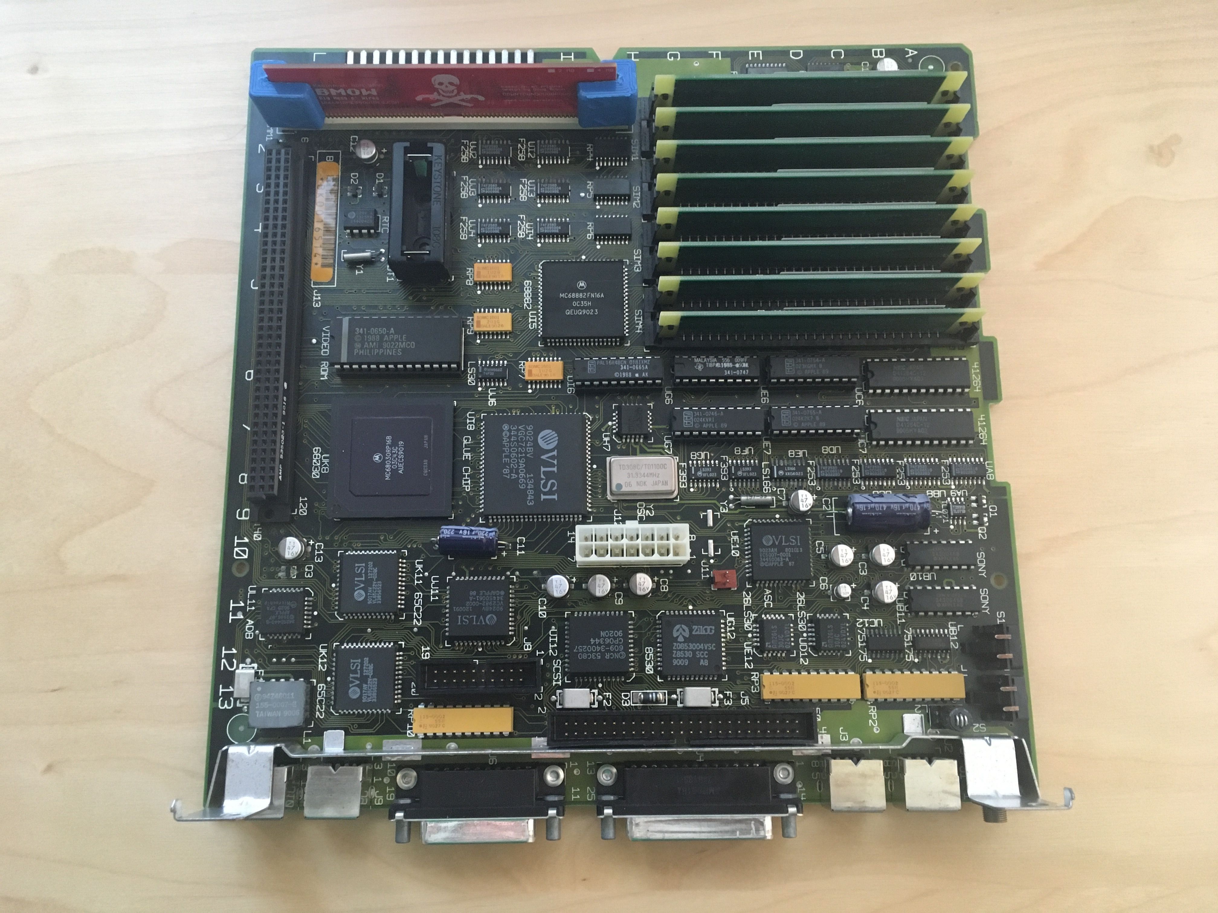 Now we can see the original state of the board. Note the little red battery in the upper left. That's our PRAM battery. Goodbye, accurate dates. Also, the upper right is where the RAM goes. Notice that we're not using all of the available slots, which seems less than ideal.